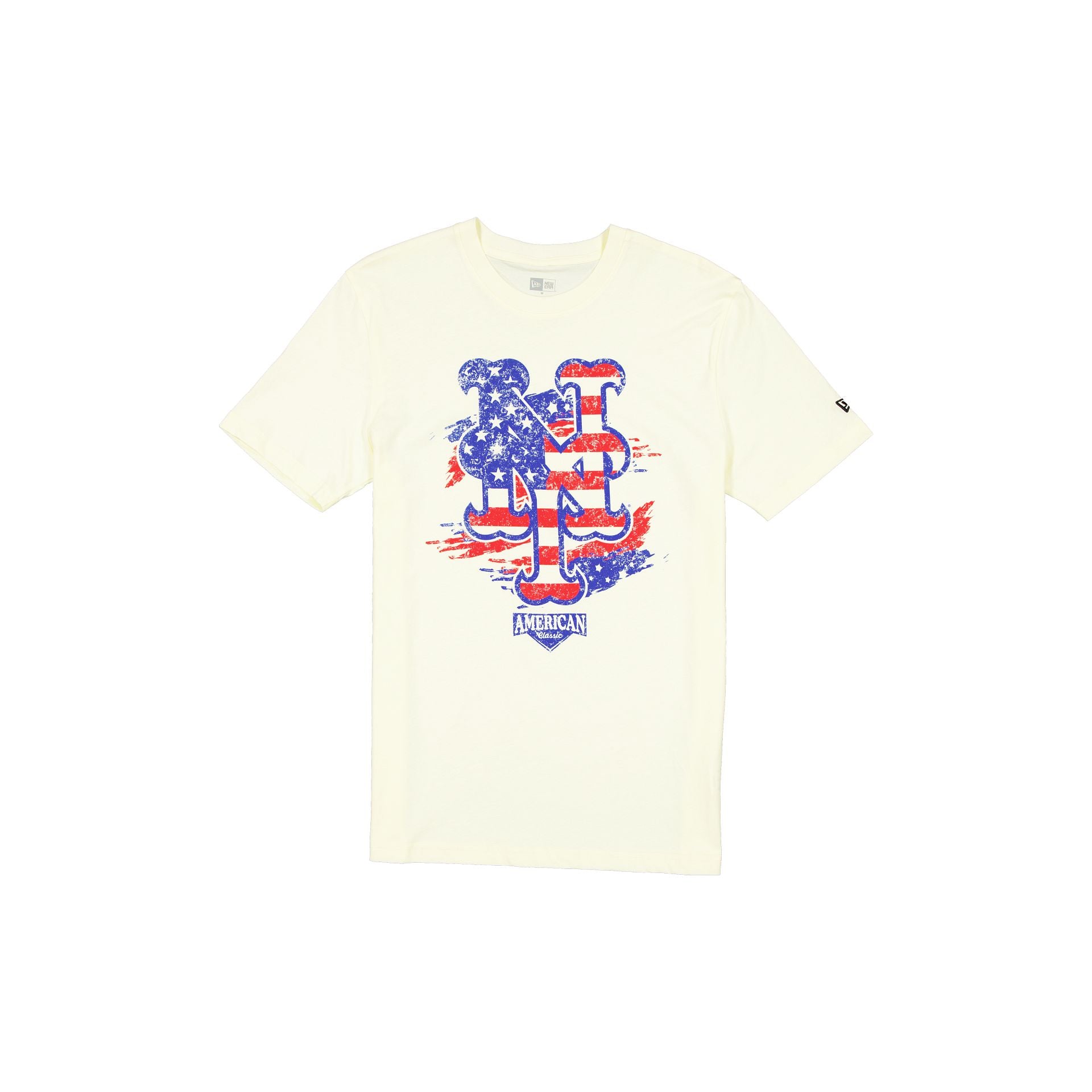 The New York Mets Independence Day 2025 T-Shirt a screen-printed American flag themed Mets logo above an American Classic wordmark at the front.