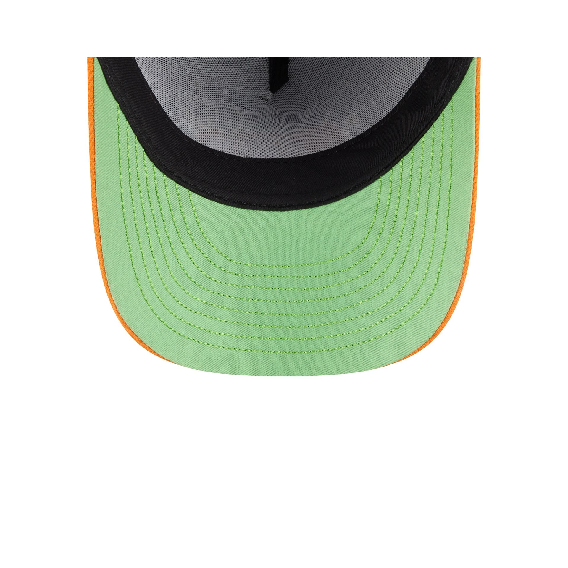 The Nickelodeon Slime x Seattle Seahawks Kids 9FORTY A-Frame Snapback features an embroidered Seahawks slime logo at the front panels with a slime splash on an orange visor. Additional details include an adjustable snapback closure at the rear and a neon green undervisor.