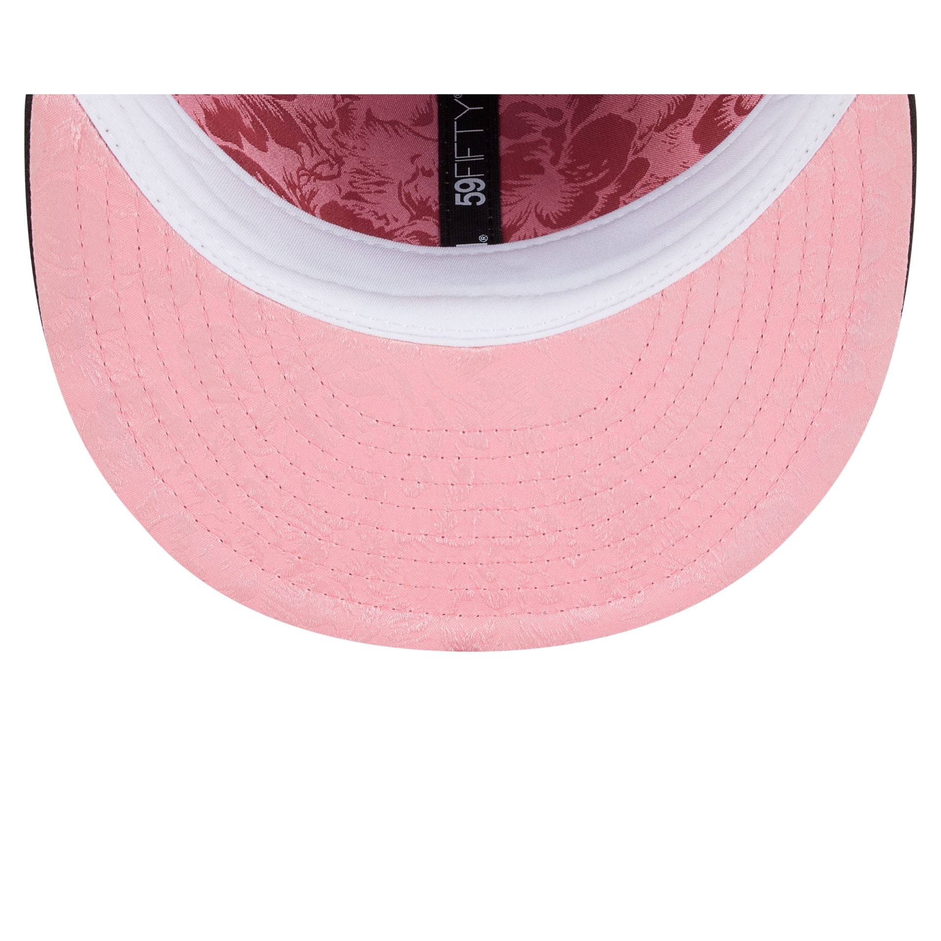 The Pittsburgh Pirates Floral Undervisor 59FIFTY Fitted Cap features an embroidered Pirates logo at the front panels with a matching MLB Batterman logo at the rear. Additional details include a floral team patch at the right-wear side with a pink floral undervisor and lining.
