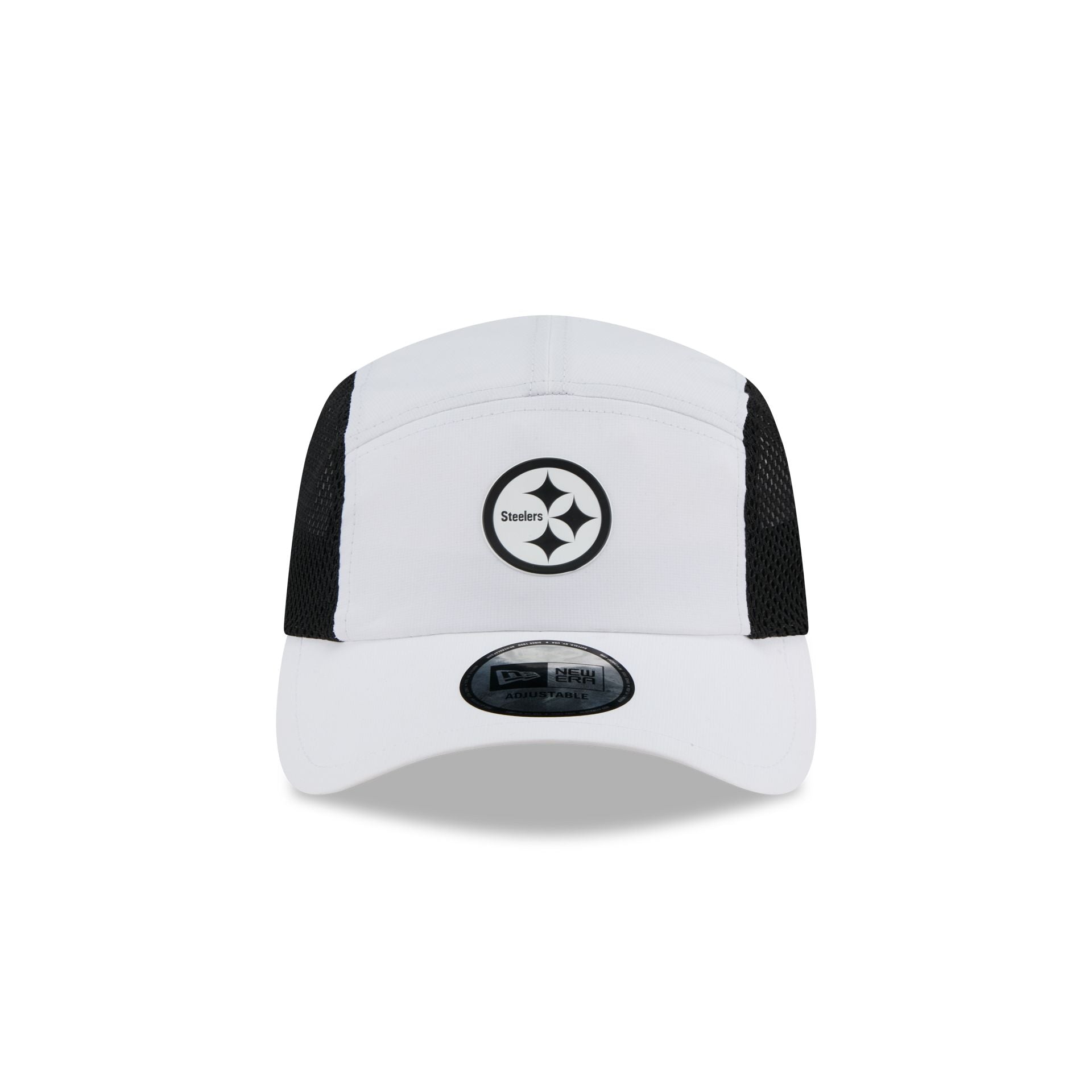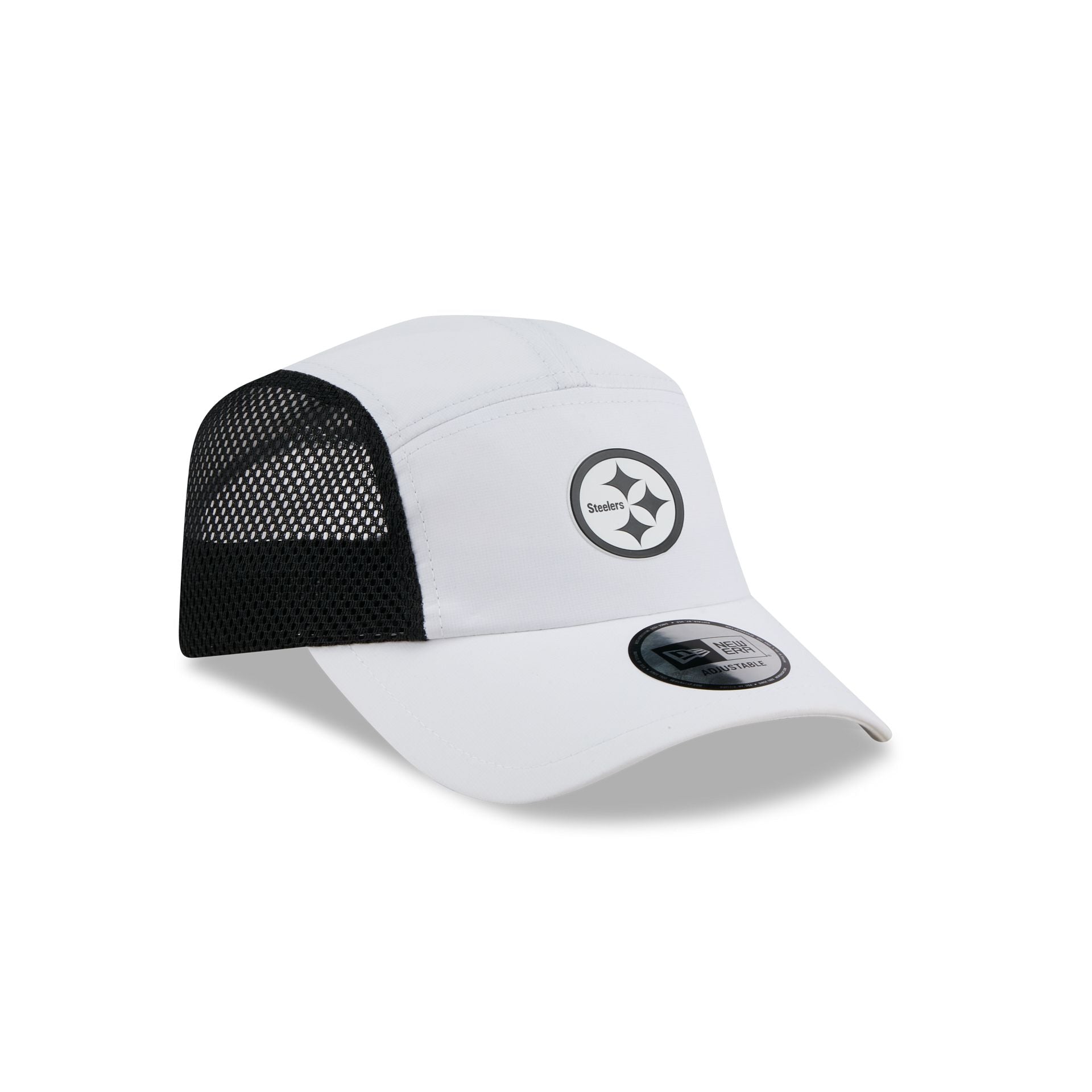 The Pittsburgh Steelers White Poly Runner Cap features a heat sealed Steelers logo at the front panels with mesh side panels. Additional details include a silicone patch above an adjustable drawstring closure at the rear.