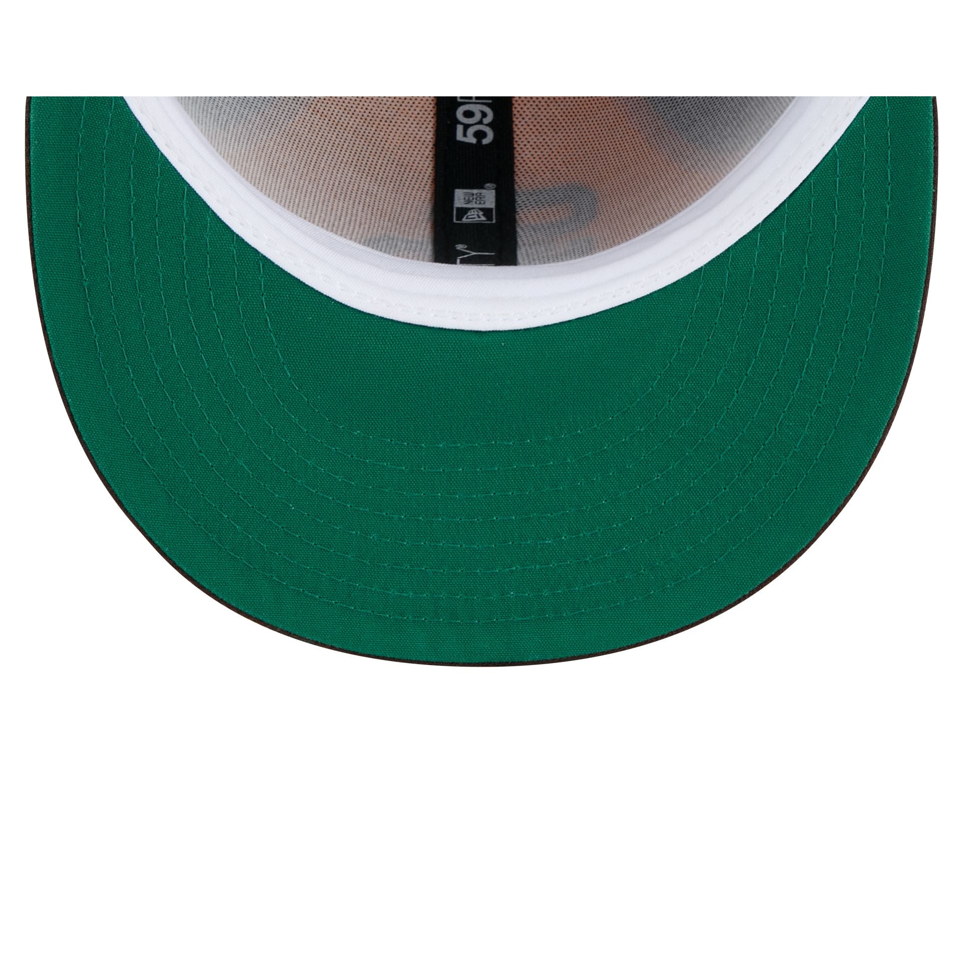 The San Diego Padres Hall of Fame 2025 59FIFTY Fitted Cap features an embroidered Padres Cooperstown logo at the front panels with a matching MLB Batterman logo at the rear. a National Baseball Hall of Fame patch at the right-wear side. and a green undervisor.