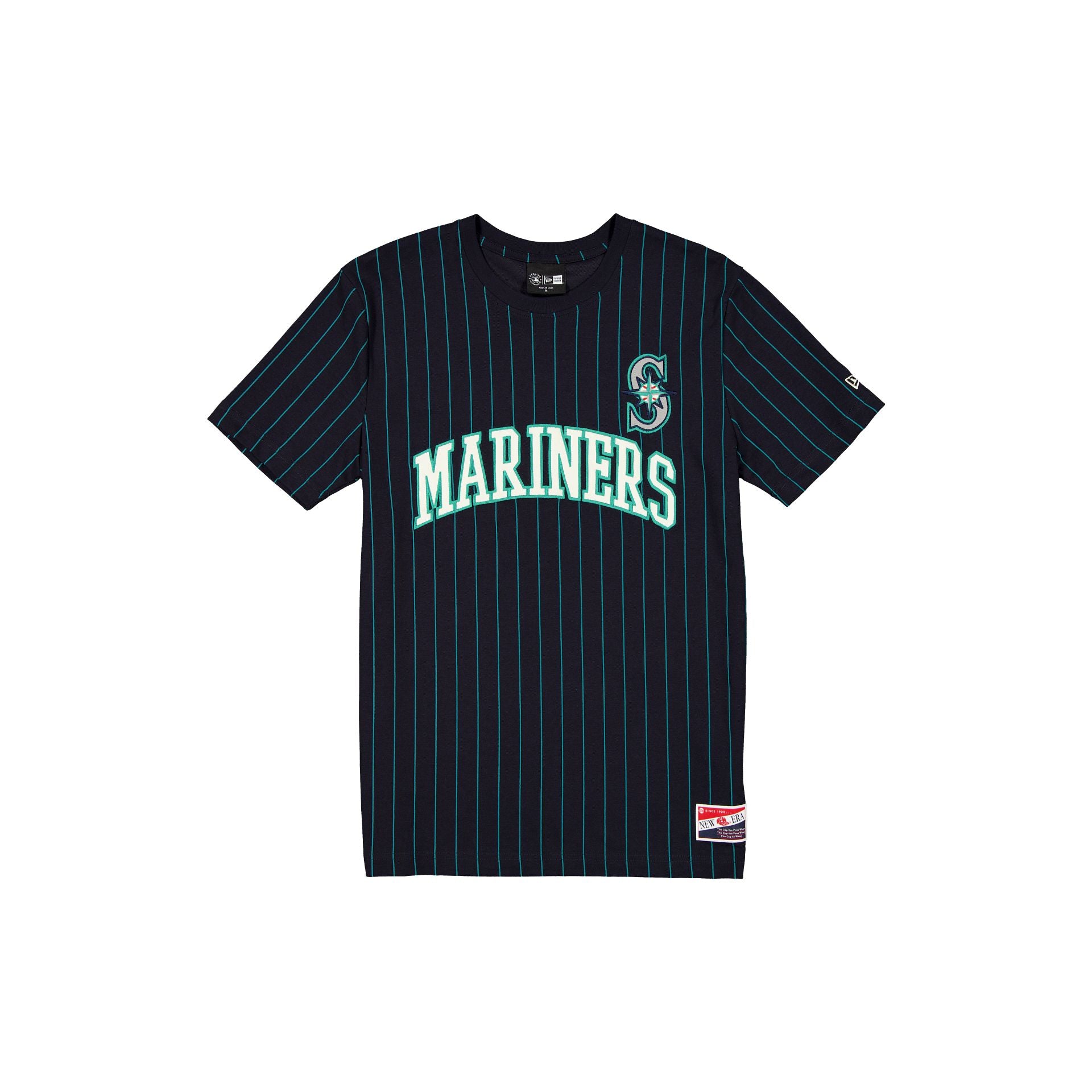 The Seattle Mariners Throwback Retro Pinstripe T-Shirt features an embroidered Mariners wordmark at the front with a twill applique logo at the left chest.