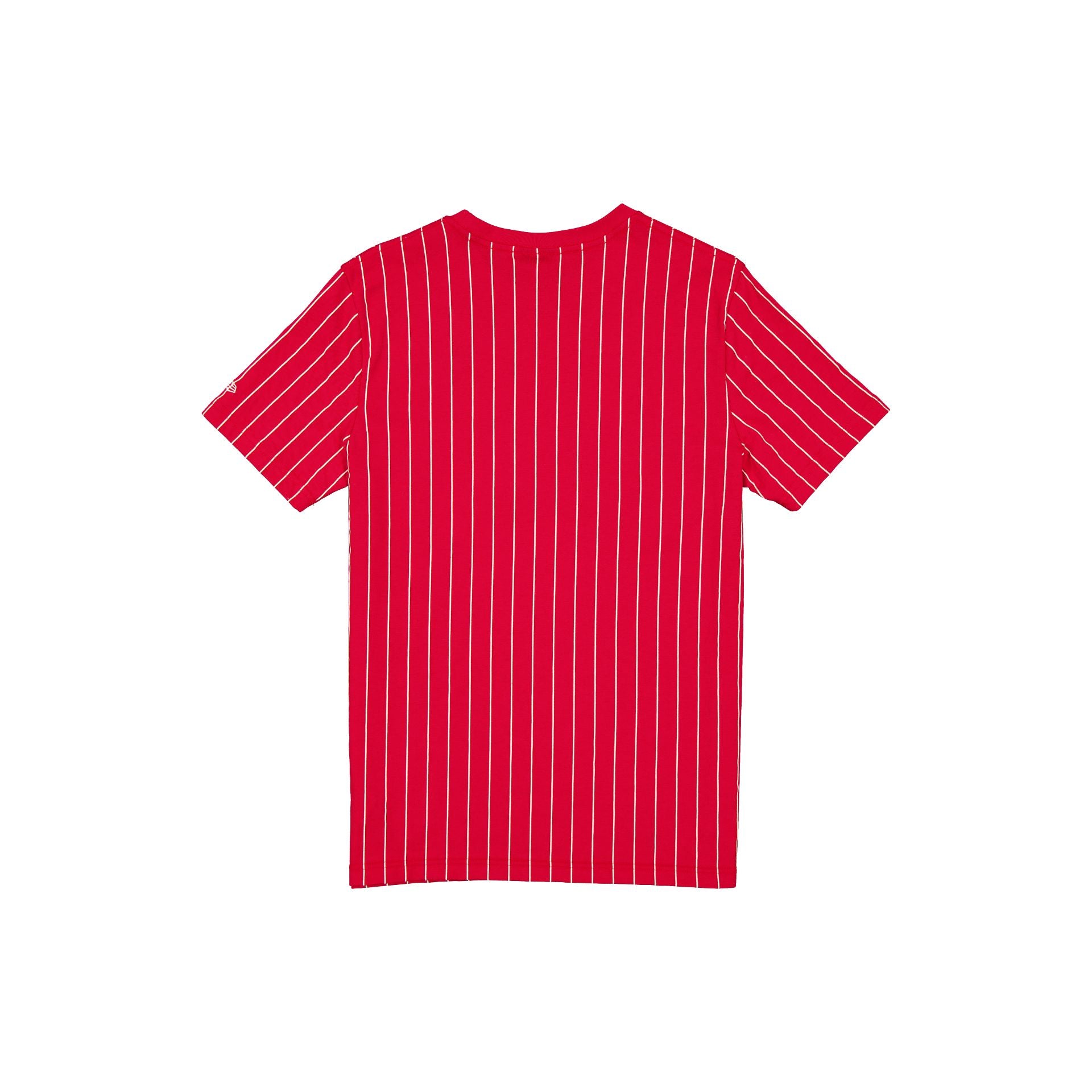The Texas Rangers Throwback Pinstripe Wordmark T-Shirt features a twill applique Rangers wordmark and logo at the front with a New Era jock tag at the left hip.