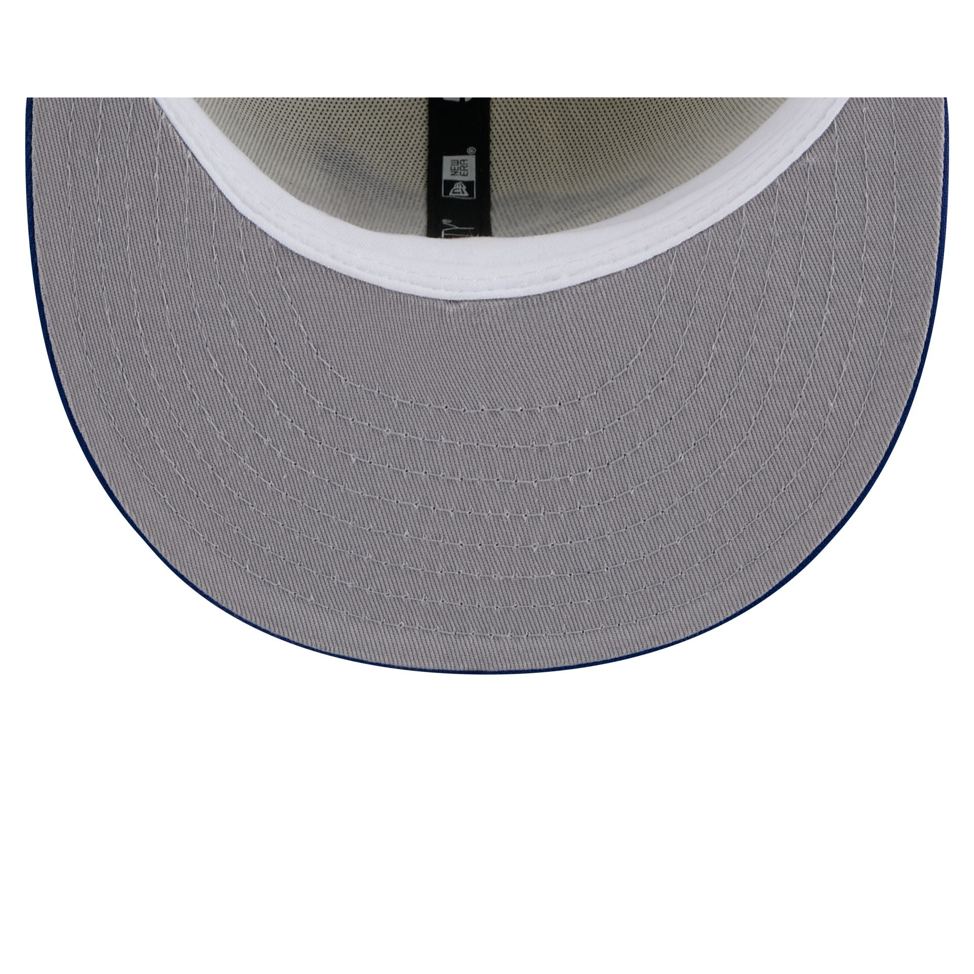The Toronto Blue Jays Chrome 59FIFTY Fitted Cap features an embroidered Blue Jays logo at the front panels with a matching MLB Batterman logo at the rear. a blue visor. and a gray undervisor.