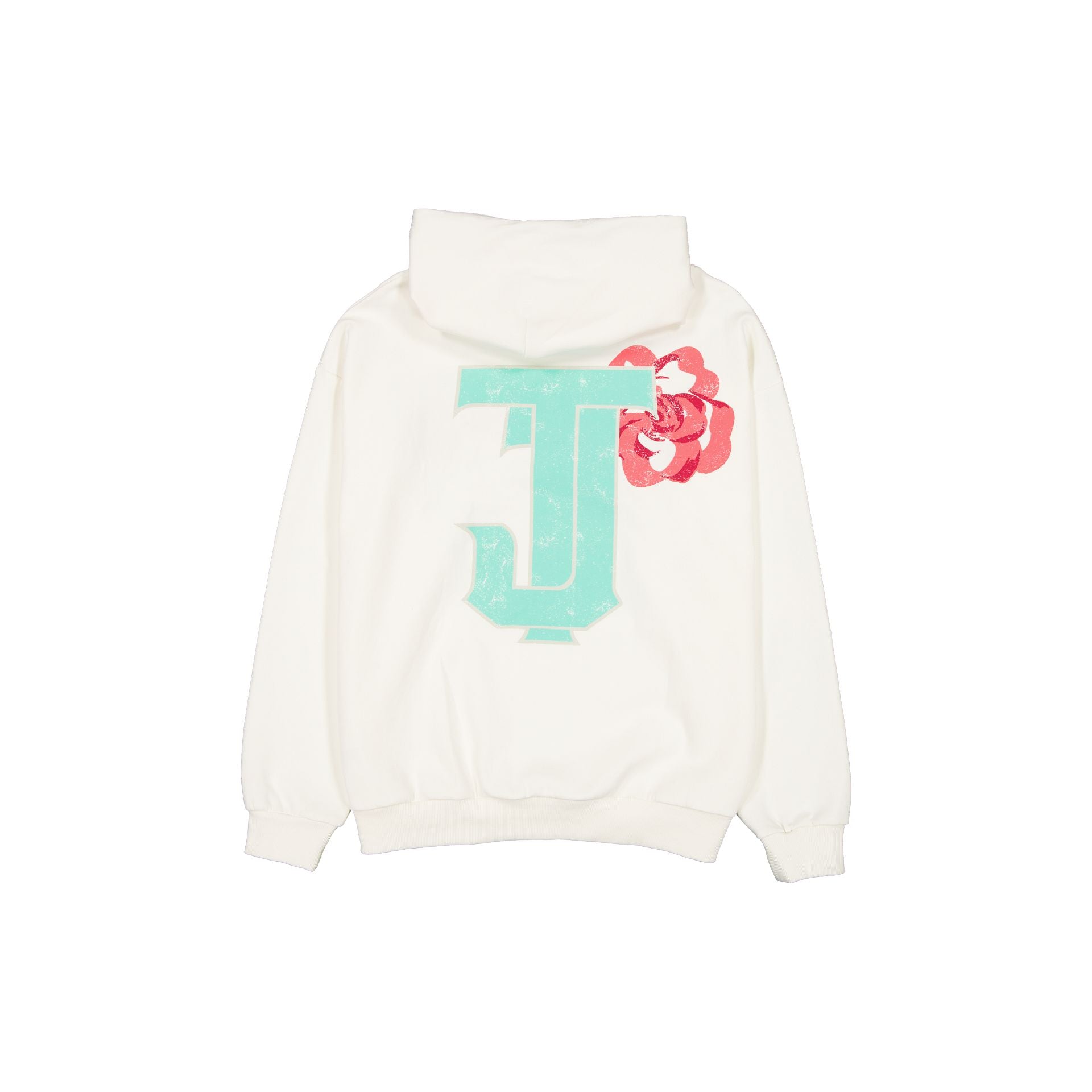 The Toros de Tijuana Stone Floral Hoodie features an embroidered Toros floral wordmark at the front with a screen-printed floral logo at the rear. Additional details include kangaroo pockets and adjustable drawstring at the hood.