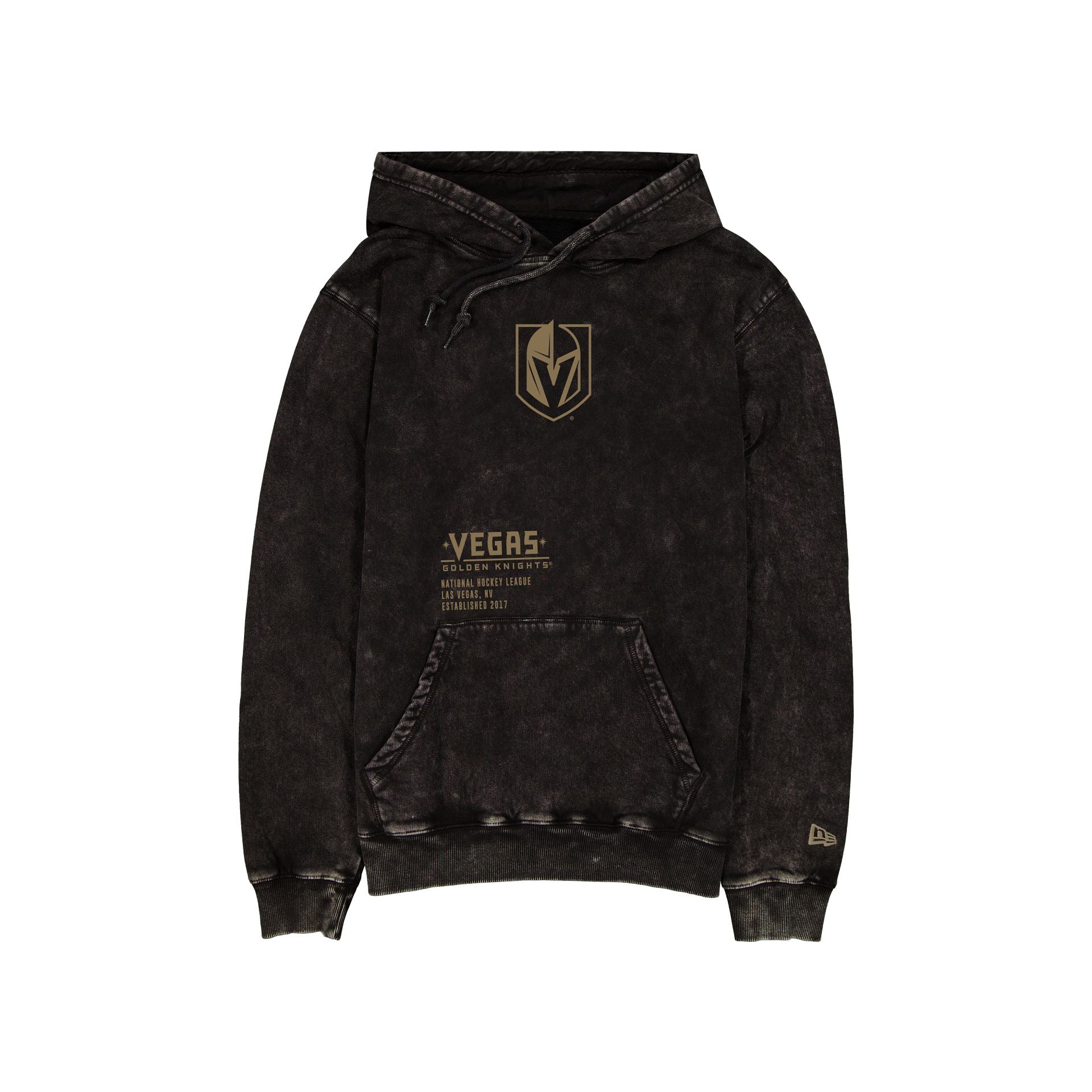 The Vegas Golden Knights Sport Night Black Hoodie features a screen-printed Golden Knights graphic at the front with kangaroo pockets and adjustable drawstrings at the hood.